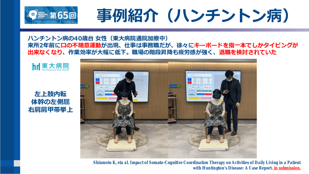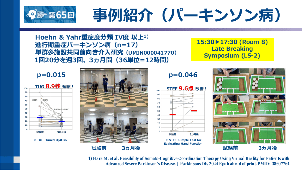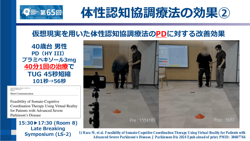 #4. 体性認知協調療法の効果② 仮想現実を用いた体性認知協調療法のPDに対する改善効果 40歳台 男性 PD(HY III) プラミペキソール3mg 40分1回の治療で TUG 45秒短縮 101秒→56秒 15:30 17:30 (Room 8) Late Breaking Symposium (LS-2) 1) Hara M, et al. Feasibility of Somato-Cognitive Coordination Therapy Using Virtual Reality for Patients with Advanced Severe Parkinson's Disease. J Parkinsons Dis 2024 Epub ahead of print. PMID: 38607764