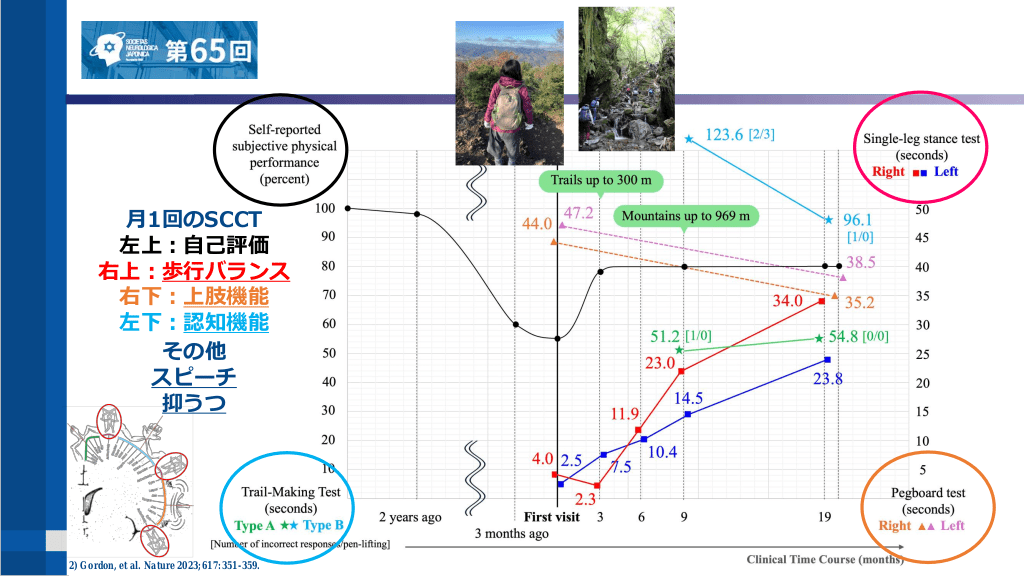 #17. 月1回のSCCT 左上:自己評価 右上:歩行バランス 右下:上肢機能 左下:認知機能 その他 スピーチ 抑うつ 2) Gordon, et al. Nature 2023;617:351-359.