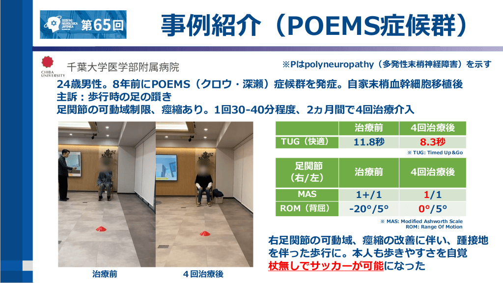 #18. 事例紹介(POEMS症候群) ※Pはpolyneuropathy(多発性末梢神経障害)を示す 24歳男性。8年前にPOEMS(クロウ・深瀬)症候群を発症。自家末梢血幹細胞移植後 主訴:歩行時の足の躓き 足関節の可動域制限、痙縮あり。1回30‐40分程度、2ヵ月間で4回治療介入 TUG(快適) 治療前 4回治療後 11.8秒 8.3秒 ※ TUG: Timed Up&Go 足関節 (右/左) MAS ROM(背屈) 治療前 4回治療後 1+/1 -20°/5° 1/1 0°/5° ※ MAS: Modified Ashworth Scale ROM: Range Of Motion 治療前 4回治療後 右足関節の可動域、痙縮の改善に伴い、踵接地 を伴った歩行に。本人も歩きやすさを自覚 杖無しでサッカーが可能になった