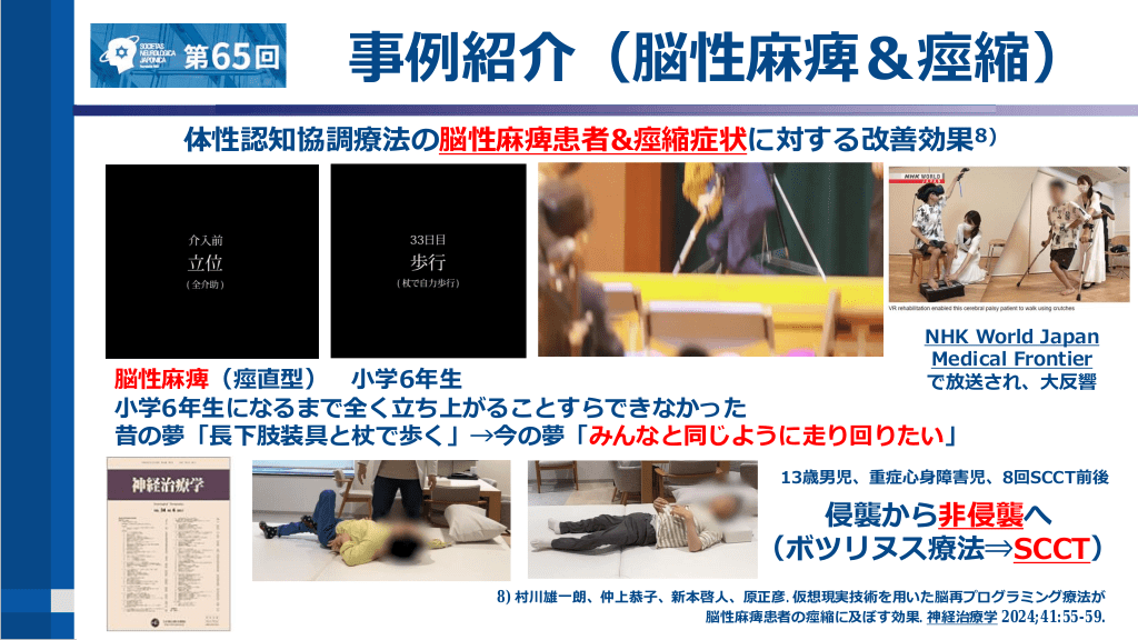 #19. 事例紹介(脳性麻痺&痙縮) 体性認知協調療法の脳性麻痺患者&痙縮症状に対する改善効果8) NHK World Japan Medical Frontier で放送され、大反響 脳性麻痺(痙直型) 小学6年生 小学6年生になるまで全く立ち上がることすらできなかった 昔の夢「長下肢装具と杖で歩く」→今の夢「みんなと同じように走り回りたい」 13歳男児、重症心身障害児、8回SCCT前後 侵襲から非侵襲へ (ボツリヌス療法⇒SCCT) 8) 村川雄一朗、仲上恭子、新本啓人、原正彦. 仮想現実技術を用いた脳再プログラミング療法が 脳性麻痺患者の痙縮に及ぼす効果. 神経治療学 2024;41:55-59.