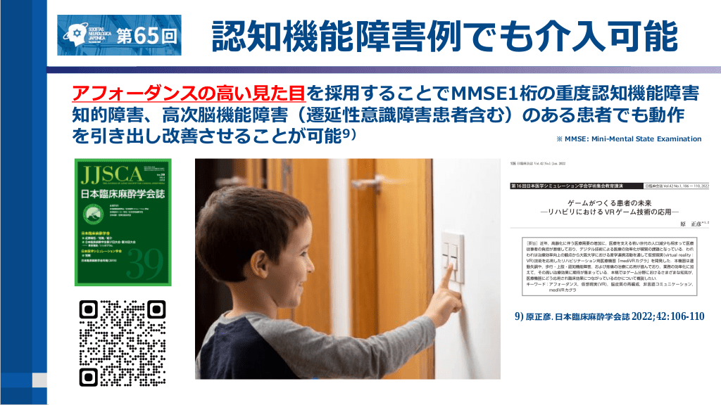 #20. 認知機能障害例でも介入可能 アフォーダンスの高い見た目を採用することでMMSE1桁の重度認知機能障害 知的障害、高次脳機能障害(遷延性意識障害患者含む)のある患者でも動作 を引き出し改善させることが可能9) ※ MMSE: Mini-Mental State Examination 9) 原正彦. 日本臨床麻酔学会誌 2022;42:106-110