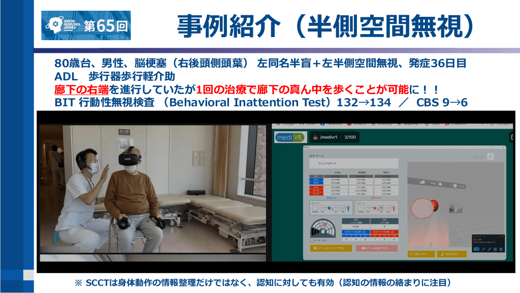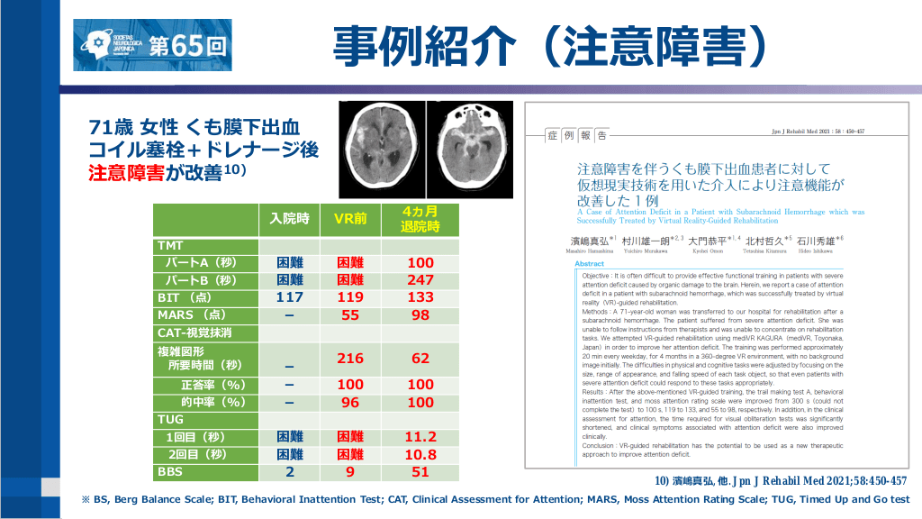 #22. 事例紹介(注意障害) 71歳 女性 くも膜下出血 コイル塞栓+ドレナージ後 注意障害が改善10) 入院時 VR前 4ヵ月 退院時 困難 困難 117 - 困難 困難 119 55 100 247 133 98 216 62 100 96 100 100 困難 困難 9 11.2 10.8 51 TMT パートA(秒) パートB(秒) BIT (点) MARS (点) CAT-視覚抹消 複雑図形 所要時間(秒) 正答率(%) 的中率(%) - - - TUG 1回目(秒) 2回目(秒) BBS 困難 困難 2 10) 濱嶋真弘, 他. Jpn J Rehabil Med 2021;58:450-457 ※ BS, Berg Balance Scale; BIT, Behavioral Inattention Test; CAT, Clinical Assessment for Attention; MARS, Moss Attention Rating Scale; TUG, Timed Up and Go test