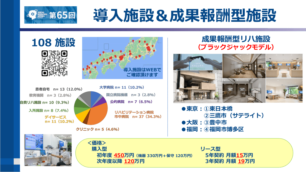 #23. 導入施設&成果報酬型施設 成果報酬型リハ施設 108 施設 (ブラックジャックモデル) 導入施設はWEBで ご確認頂けます ●東京:①東日本橋 ②三鷹市(サテライト) ●大阪:③豊中市 ●福岡:④福岡市博多区 <価格> 購入型 初年度 450万円(機器 330万円+保守 120万円) 次年度以降 120万円 リース型 5年契約 月額15万円 3年契約 月額 19万円