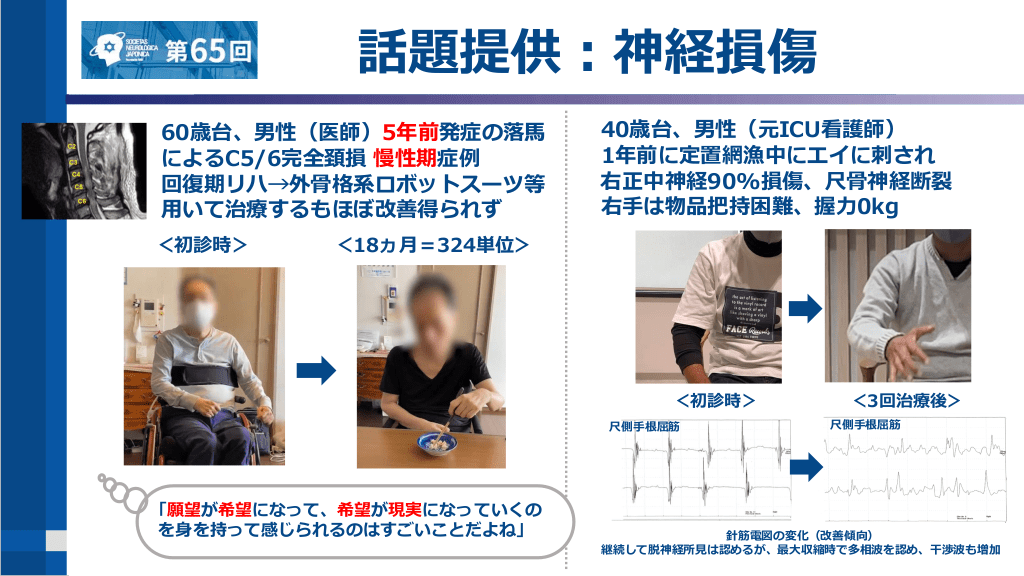 #24. 話題提供:神経損傷 60歳台、男性(医師)5年前発症の落馬 によるC5/6完全頚損 慢性期症例 回復期リハ→外骨格系ロボットスーツ等 用いて治療するもほぼ改善得られず <初診時> 40歳台、男性(元ICU看護師) 1年前に定置網漁中にエイに刺され 右正中神経90%損傷、尺骨神経断裂 右手は物品把持困難、握力0kg <18ヵ月=324単位> <初診時> 尺側手根屈筋 「願望が希望になって、希望が現実になっていくの を身を持って感じられるのはすごいことだよね」 <3回治療後> 尺側手根屈筋 針筋電図の変化(改善傾向) 継続して脱神経所見は認めるが、最大収縮時で多相波を認め、干渉波も増加