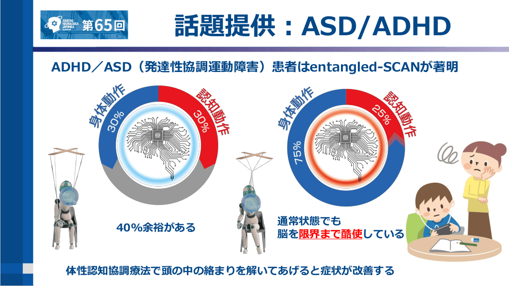 #25. 話題提供:ASD/ADHD ADHD/ASD(発達性協調運動障害)患者はentangled-SCANが著明 40%余裕がある 通常状態でも 脳を限界まで酷使している 体性認知協調療法で頭の中の絡まりを解いてあげると症状が改善する