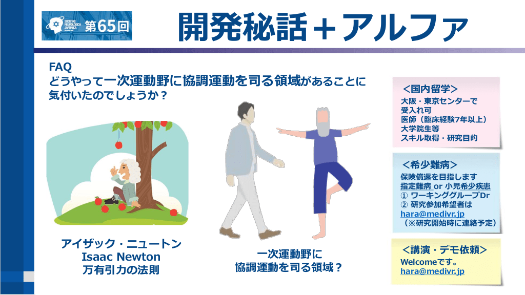 #27. 開発秘話+アルファ FAQ どうやって一次運動野に協調運動を司る領域があることに 気付いたのでしょうか? <国内留学> 大阪・東京センターで 受入れ可 医師(臨床経験7年以上) 大学院生等 スキル取得・研究目的 <希少難病> 保険償還を目指します 指定難病 or 小児希少疾患 ① ワーキンググループDr ② 研究参加希望者は hara@medivr.jp (※研究開始時に連絡予定) アイザック・ニュートン Isaac Newton 万有引力の法則 一次運動野に 協調運動を司る領域? <講演・デモ依頼> Welcomeです。 hara@medivr.jp