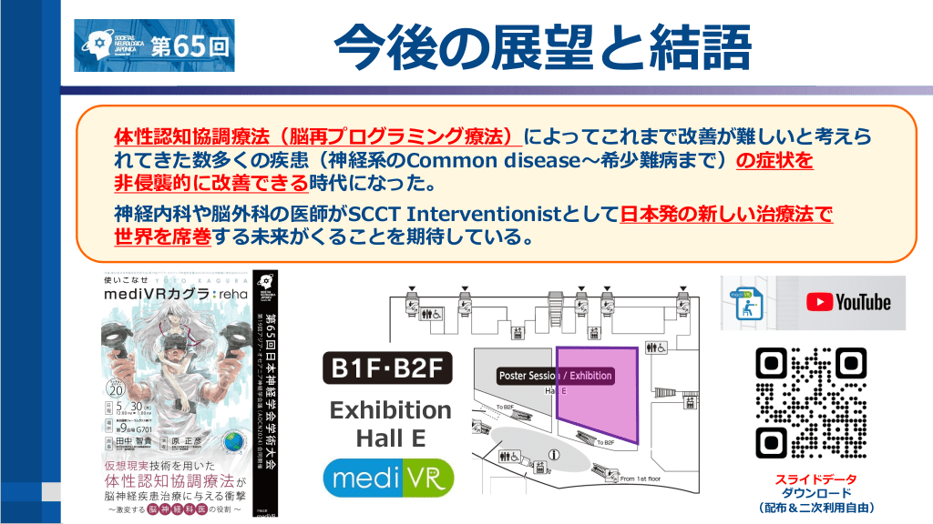 #28. 今後の展望と結語 体性認知協調療法(脳再プログラミング療法)によってこれまで改善が難しいと考えら れてきた数多くの疾患(神経系のCommon disease~希少難病まで)の症状を 非侵襲的に改善できる時代になった。 神経内科や脳外科の医師がSCCT Interventionistとして日本発の新しい治療法で 世界を席巻する未来がくることを期待している。 Exhibition Hall E スライドデータ ダウンロード (配布&二次利用自由)