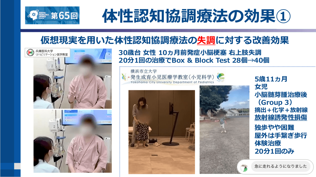 #3. 体性認知協調療法の効果① 仮想現実を用いた体性認知協調療法の失調に対する改善効果 30歳台 女性 10ヵ月前発症小脳梗塞 右上肢失調 20分1回の治療でBox & Block Test 28個→40個 5歳11ヵ月 女児 小脳髄芽腫治療後 (Group 3) 摘出+化学+放射線 放射線誘発性損傷 独歩やや困難 屋外は手繋ぎ歩行 体験治療 20分1回のみ