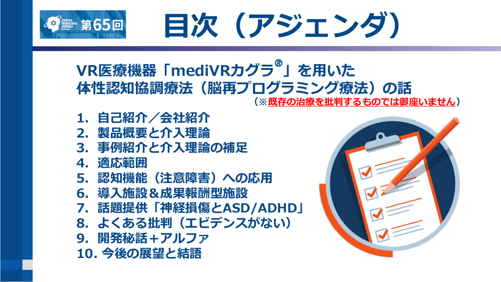 #5. 目次(アジェンダ) 🄬 VR医療機器「mediVRカグラ 」を用いた 体性認知協調療法(脳再プログラミング療法)の話 (※既存の治療を批判するものでは御座いません) 1. 自己紹介/会社紹介 2. 製品概要と介入理論 3. 事例紹介と介入理論の補足 4. 適応範囲 5. 認知機能(注意障害)への応用 6. 導入施設&成果報酬型施設 7. 話題提供「神経損傷とASD/ADHD」 8. よくある批判(エビデンスがない) 9. 開発秘話+アルファ 10. 今後の展望と結語