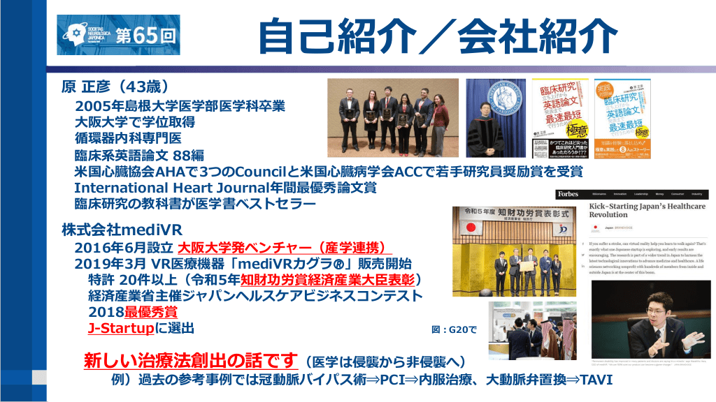 #1. 第65回日本神経学会学術大会 ランチョンセミナー20 第9会場(G701) 2024年5月30日 12:00 13:00 仮想現実技術を用いた体性認知協調療法が 脳神経疾患治療に与える衝撃 ~激変する脳神経科医の役割~ スライドデータ ダウンロード (配布&二次利用自由) 株式会社mediVR 代表取締役社長 島根大学 地域包括ケア教育研究センター 客員教授 原 正彦, MD, PhD E-mail : hara@medivr.jp