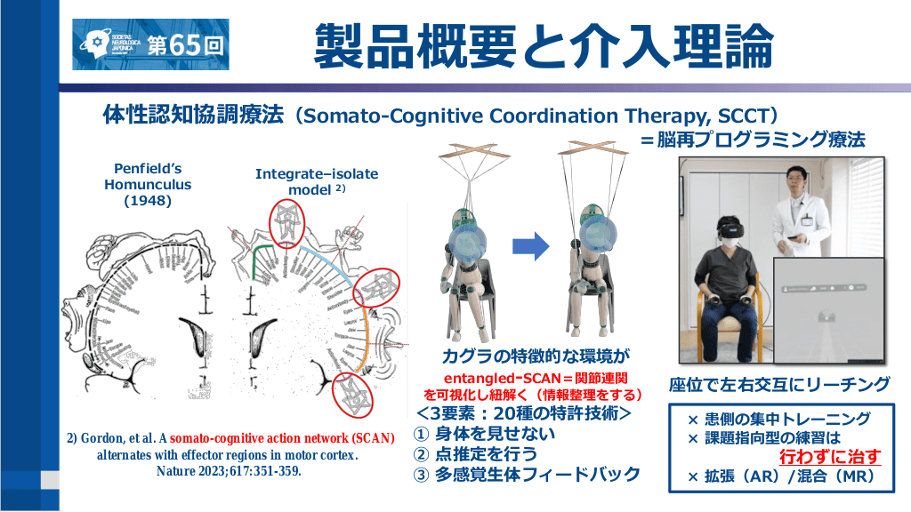 #7. 製品概要と介入理論 体性認知協調療法(Somato-Cognitive Coordination Therapy, SCCT) =脳再プログラミング療法 Penfield’s Homunculus (1948) Integrate–isolate model 2) カグラの特徴的な環境が entangled‐SCAN=関節連関 を可視化し紐解く(情報整理をする) 2) Gordon, et al. A somato-cognitive action network (SCAN) alternates with effector regions in motor cortex. Nature 2023;617:351-359. <3要素:20種の特許技術> ① 身体を見せない ② 点推定を行う ③ 多感覚生体フィードバック 座位で左右交互にリーチング × 患側の集中トレーニング × 課題指向型の練習は 行わずに治す × 拡張(AR)/混合(MR)