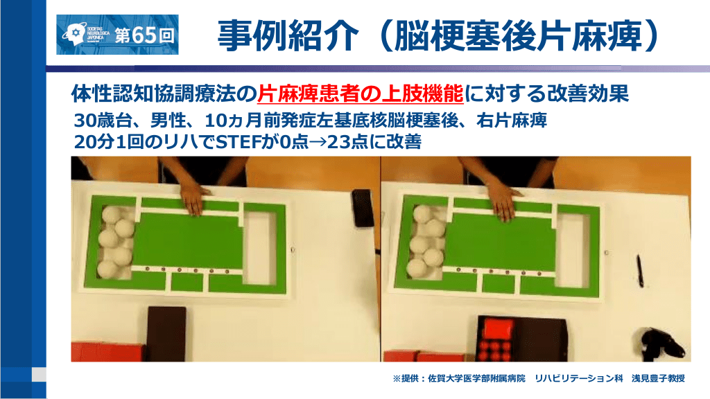 #9. 事例紹介(脳梗塞後片麻痺) 体性認知協調療法の片麻痺患者の上肢機能に対する改善効果 30歳台、男性、10ヵ月前発症左基底核脳梗塞後、右片麻痺 20分1回のリハでSTEFが0点→23点に改善 ※提供:佐賀大学医学部附属病院 リハビリテーション科 浅見豊子教授