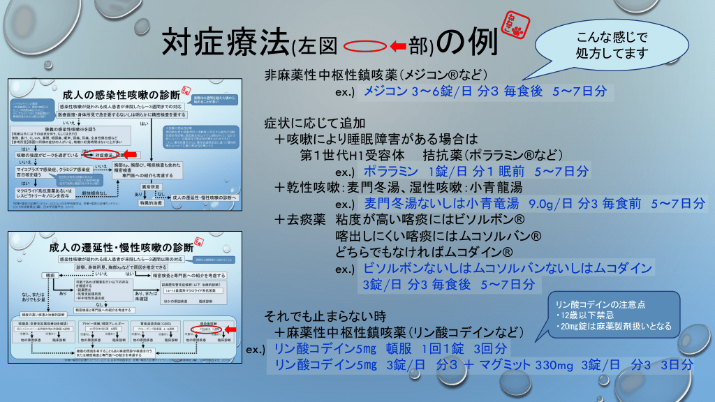 #13. 対症療法(左図 部)の例 こんな感じで 処方してます 非麻薬性中枢性鎮咳薬(メジコン®など) ex.) メジコン 3~6錠/日 分3 毎食後 5~7日分 症状に応じて追加 +咳嗽により睡眠障害がある場合は 第1世代H1受容体 拮抗薬(ポララミン®など) ex.) ポララミン 1錠/日 分1 眠前 5~7日分 +乾性咳嗽:麦門冬湯、湿性咳嗽:小青龍湯 ex.) 麦門冬湯ないしは小青竜湯 9.0g/日 分3 毎食前 5~7日分 +去痰薬 粘度が高い喀痰にはビソルボン® 喀出しにくい喀痰にはムコソルバン® どちらでもなければムコダイン® ex.) ビソルボンないしはムコソルバンないしはムコダイン 3錠/日 分3 毎食後 5~7日分 リン酸コデインの注意点 ・12歳以下禁忌 ・20㎎錠は麻薬製剤扱いとなる それでも止まらない時 +麻薬性中枢性鎮咳薬(リン酸コデインなど) ex.) リン酸コデイン5㎎ 頓服 1回1錠 3回分 リン酸コデイン5㎎ 3錠/日 分3 + マグミット 330mg 3錠/日 分3 3日分