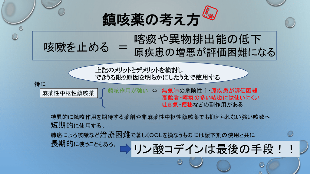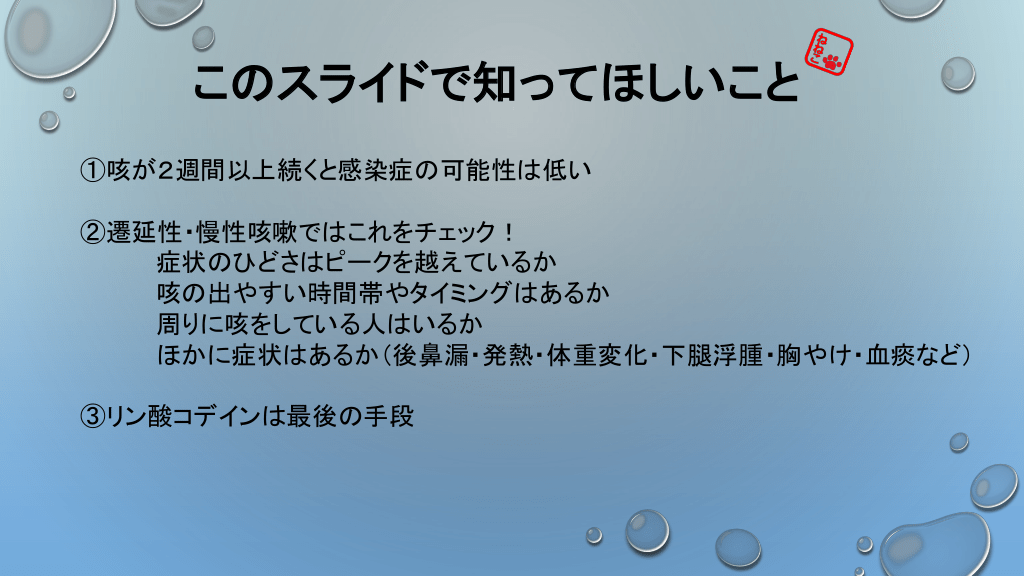 #2. このスライドで知ってほしいこと ①咳が2週間以上続くと感染症の可能性は低い ②遷延性・慢性咳嗽ではこれをチェック! 症状のひどさはピークを越えているか 咳の出やすい時間帯やタイミングはあるか 周りに咳をしている人はいるか ほかに症状はあるか(後鼻漏・発熱・体重変化・下腿浮腫・胸やけ・血痰など) ③リン酸コデインは最後の手段