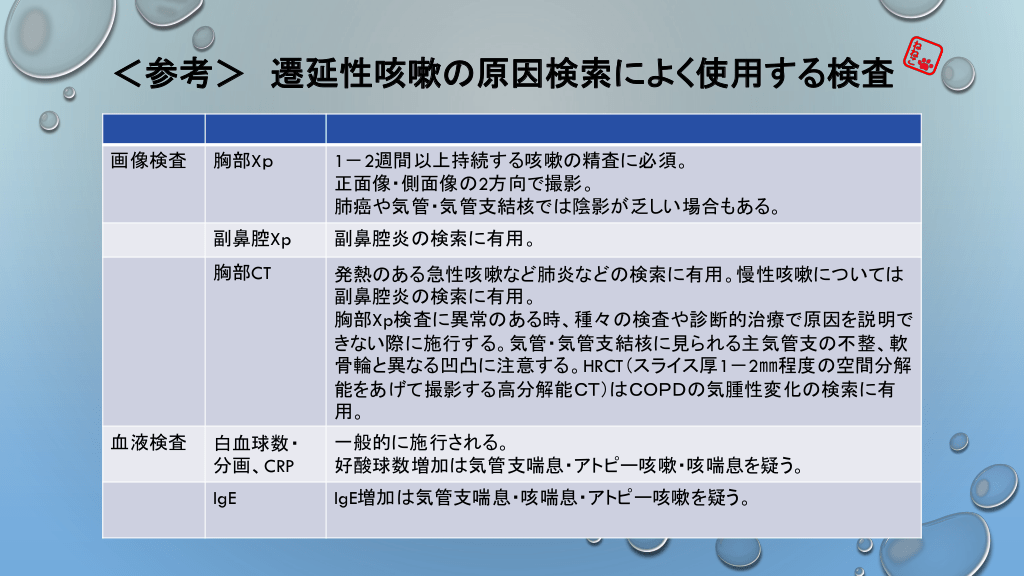 #15. <参考> 遷延性咳嗽の原因検索によく使用する検査 画像検査 血液検査 胸部Xp 1-2週間以上持続する咳嗽の精査に必須。 正面像・側面像の2方向で撮影。 肺癌や気管・気管支結核では陰影が乏しい場合もある。 副鼻腔Xp 副鼻腔炎の検索に有用。 胸部CT 発熱のある急性咳嗽など肺炎などの検索に有用。慢性咳嗽については 副鼻腔炎の検索に有用。 胸部Xp検査に異常のある時、種々の検査や診断的治療で原因を説明で きない際に施行する。気管・気管支結核に見られる主気管支の不整、軟 骨輪と異なる凹凸に注意する。HRCT(スライス厚1-2㎜程度の空間分解 能をあげて撮影する高分解能CT)はCOPDの気腫性変化の検索に有 用。 白血球数・ 分画、CRP 一般的に施行される。 好酸球数増加は気管支喘息・アトピー咳嗽・咳喘息を疑う。 IgE IgE増加は気管支喘息・咳喘息・アトピー咳嗽を疑う。