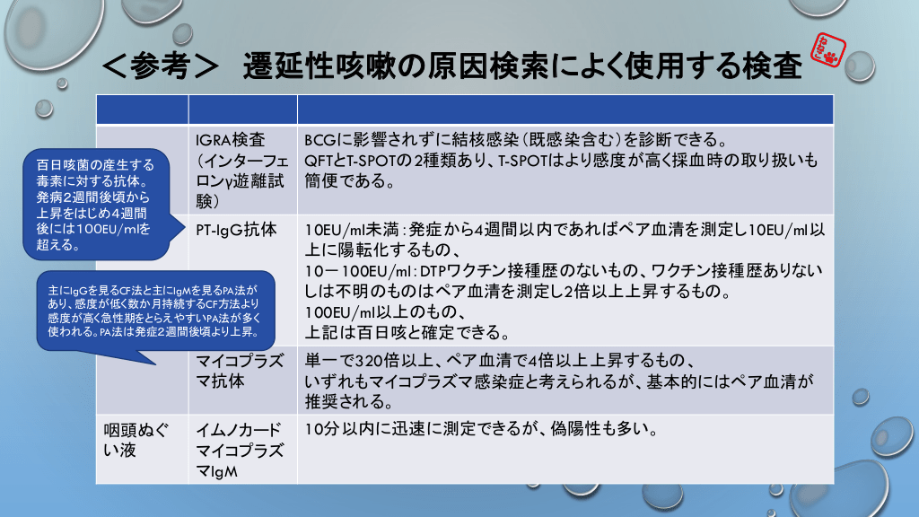 #16. <参考> 遷延性咳嗽の原因検索によく使用する検査 百日咳菌の産生する 毒素に対する抗体。 発病2週間後頃から 上昇をはじめ4週間 後には100EU/mlを 超える。 IGRA検査 BCGに影響されずに結核感染(既感染含む)を診断できる。 (インターフェ QFTとT-SPOTの2種類あり、T-SPOTはより感度が高く採血時の取り扱いも ロンγ遊離試 簡便である。 験) PT-IgG抗体 主にIgGを見るCF法と主にIgMを見るPA法が あり、感度が低く数か月持続するCF方法より 感度が高く急性期をとらえやすいPA法が多く 使われる。PA法は発症2週間後頃より上昇。 咽頭ぬぐ い液 10EU/ml未満:発症から4週間以内であればペア血清を測定し10EU/ml以 上に陽転化するもの、 10-100EU/ml:DTPワクチン接種歴のないもの、ワクチン接種歴ありない しは不明のものはペア血清を測定し2倍以上上昇するもの。 100EU/ml以上のもの、 上記は百日咳と確定できる。 マイコプラズ マ抗体 単一で320倍以上、ペア血清で4倍以上上昇するもの、 いずれもマイコプラズマ感染症と考えられるが、基本的にはペア血清が 推奨される。 イムノカード マイコプラズ マIgM 10分以内に迅速に測定できるが、偽陽性も多い。