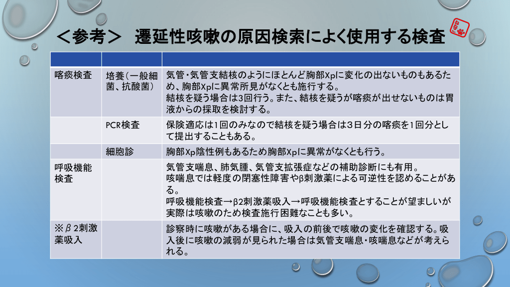 #17. <参考> 遷延性咳嗽の原因検索によく使用する検査 喀痰検査 培養(一般細 気管・気管支結核のようにほとんど胸部Xpに変化の出ないものもあるた 菌、抗酸菌) め、胸部Xpに異常所見がなくとも施行する。 結核を疑う場合は3回行う。また、結核を疑うが喀痰が出せないものは胃 液からの採取を検討する。 PCR検査 保険適応は1回のみなので結核を疑う場合は3日分の喀痰を1回分とし て提出することもある。 細胞診 胸部Xp陰性例もあるため胸部Xpに異常がなくとも行う。 呼吸機能 検査 気管支喘息、肺気腫、気管支拡張症などの補助診断にも有用。 咳喘息では軽度の閉塞性障害やβ刺激薬による可逆性を認めることがあ る。 呼吸機能検査→β2刺激薬吸入→呼吸機能検査とすることが望ましいが 実際は咳嗽のため検査施行困難なことも多い。 ※β2刺激 薬吸入 診察時に咳嗽がある場合に、吸入の前後で咳嗽の変化を確認する。吸 入後に咳嗽の減弱が見られた場合は気管支喘息・咳喘息などが考えら れる。