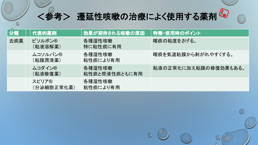 #21. <参考> 遷延性咳嗽の治療によく使用する薬剤 分類 代表的薬剤 効果が期待される咳嗽の原因 特徴・使用時のポイント 去痰薬 ビソルボン® (粘液溶解薬) 各種湿性咳嗽 特に粘性痰に有用 喀痰の粘度をさげる。 ムコソルバン® (粘膜潤滑薬) 各種湿性咳嗽 粘性痰により有用 喀痰を気道粘膜から剝がれやすくする。 ムコダイン® (粘液修復薬) 各種湿性咳嗽 粘性痰と漿液性痰ともに有用 粘液の正常化に加え粘膜の修復効果もある。 スピリア® (分泌細胞正常化薬) 各種湿性咳嗽 粘性痰により有用