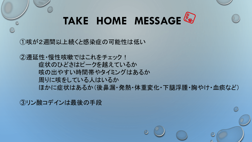 #23. TAKE HOME MESSAGE ①咳が2週間以上続くと感染症の可能性は低い ②遷延性・慢性咳嗽ではこれをチェック! 症状のひどさはピークを越えているか 咳の出やすい時間帯やタイミングはあるか 周りに咳をしている人はいるか ほかに症状はあるか(後鼻漏・発熱・体重変化・下腿浮腫・胸やけ・血痰など) ③リン酸コデインは最後の手段
