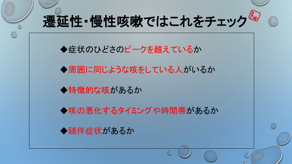#6. 遷延性・慢性咳嗽ではこれをチェック ◆症状のひどさのピークを越えているか ◆周囲に同じような咳をしている人がいるか ◆特徴的な咳があるか ◆咳の悪化するタイミングや時間帯があるか ◆随伴症状があるか