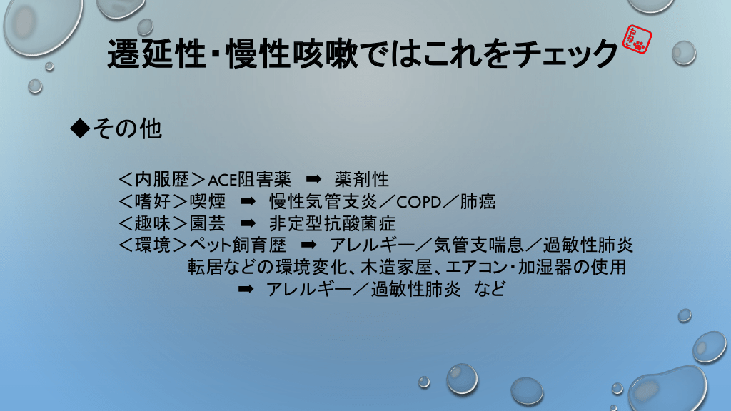 #9. 遷延性・慢性咳嗽ではこれをチェック ◆その他 <内服歴>ACE阻害薬 ➡ 薬剤性 <嗜好>喫煙 ➡ 慢性気管支炎/COPD/肺癌 <趣味>園芸 ➡ 非定型抗酸菌症 <環境>ペット飼育歴 ➡ アレルギー/気管支喘息/過敏性肺炎 転居などの環境変化、木造家屋、エアコン・加湿器の使用 ➡ アレルギー/過敏性肺炎 など