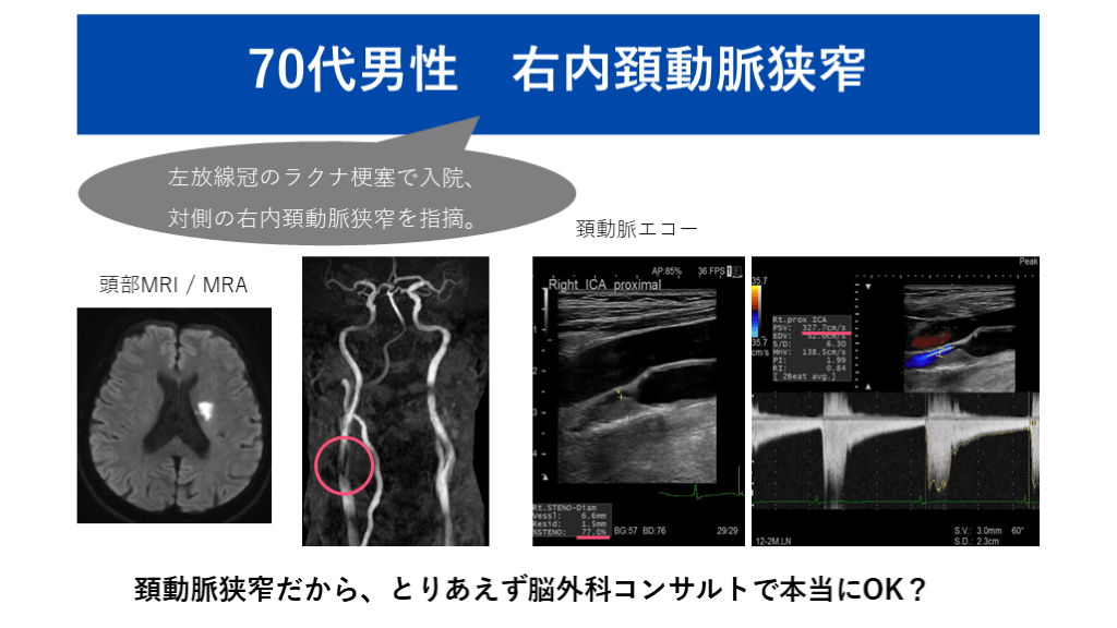 対側の右内頚動脈狭窄を指摘。 頭部MRI / MRA 頚動脈エコー 頚動脈狭窄だから、とりあえず脳外科コンサルトで本当にOK?
