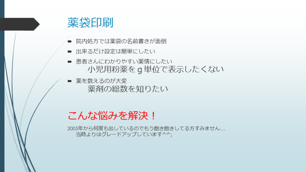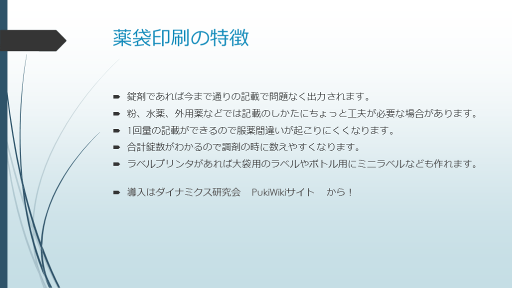 ダイナミクスを利用している院内処方の先生方にはとても便利に使って頂いている、薬袋印刷の紹介です。最新バージョンの解説となっております。旧バージョンで困っていないよ、と言う先生方も是非一度ご覧ください。かなり便利になっていると思います。