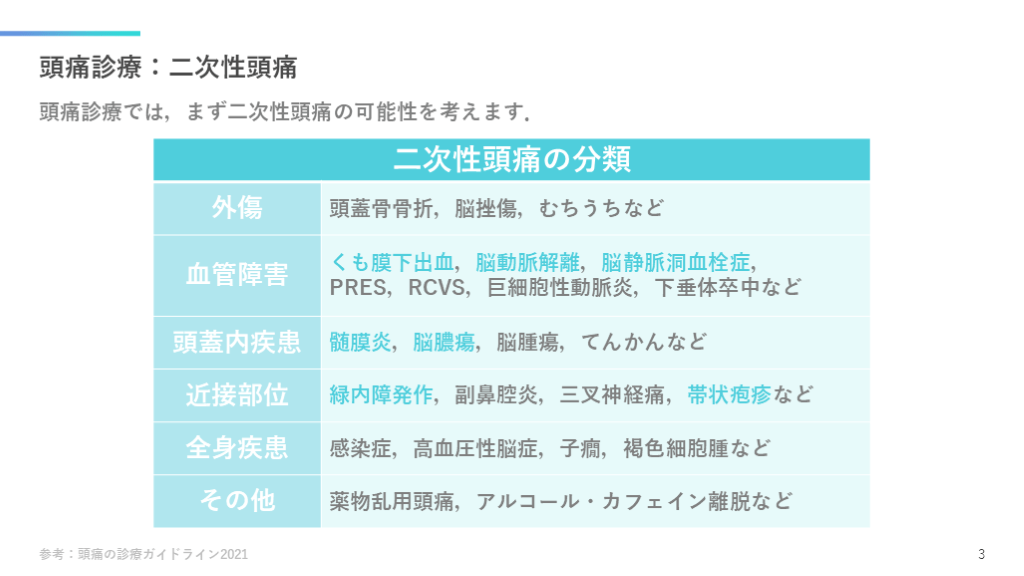#4. 頭痛診療:二次性頭痛 頭痛診療では,まず二次性頭痛の可能性を考えます. 参考:頭痛の診療ガイドライン2021 3