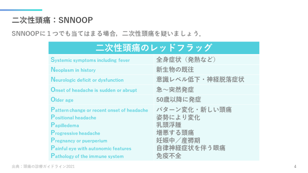 #5. 二次性頭痛:SNNOOP SNNOOPに1つでも当てはまる場合,二次性頭痛を疑いましょう. 出典:頭痛の診療ガイドライン2021 4