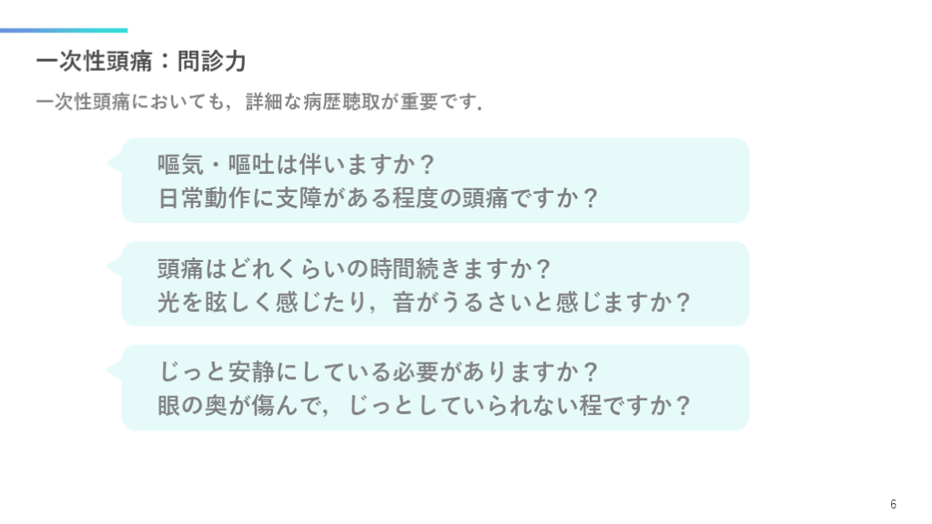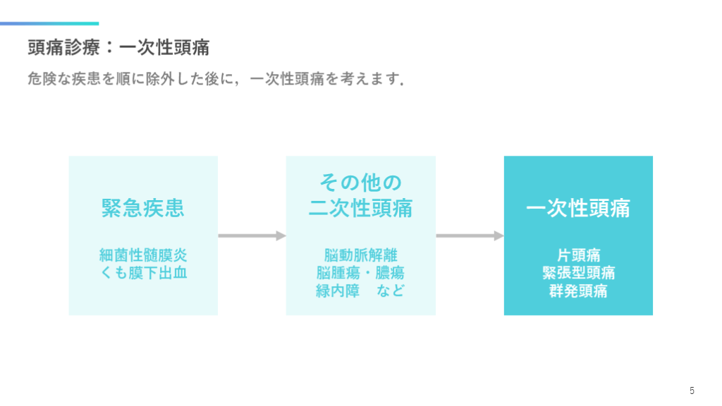 #6. 頭痛診療:一次性頭痛 危険な疾患を順に除外した後に,一次性頭痛を考えます. 5