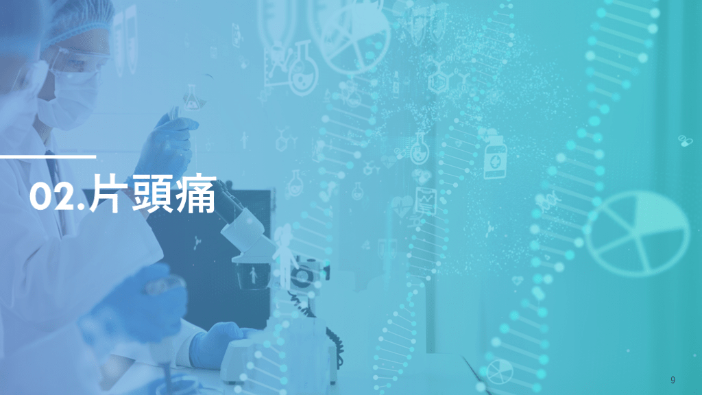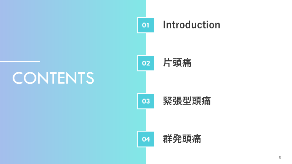 #9. CONTENTS 8 Introduction 片頭痛 緊張型頭痛 群発頭痛 01 02 03 04