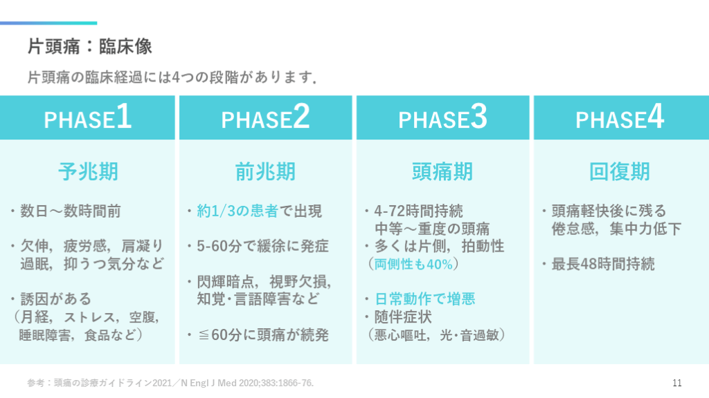 #12. 片頭痛:臨床像 片頭痛の臨床経過には4つの段階があります. 参考:頭痛の診療ガイドライン2021/N Engl J Med 2020;383:1866-76. 11