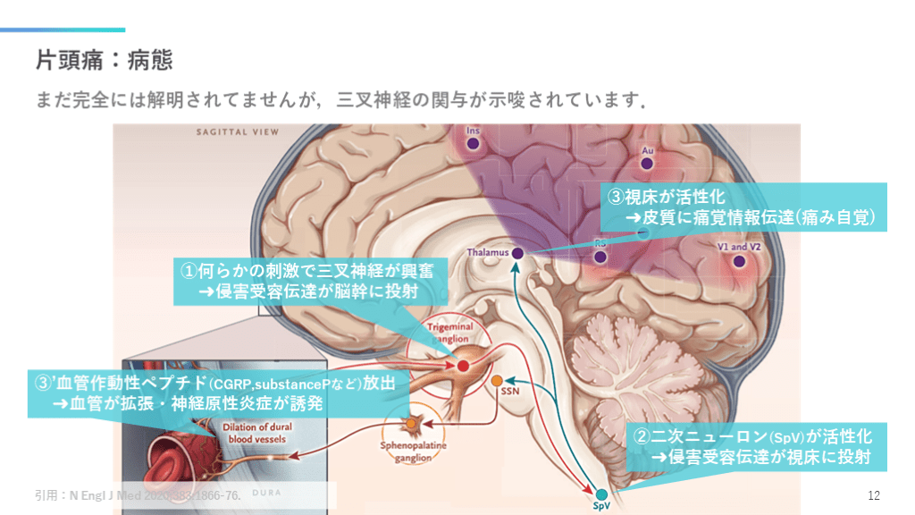 ➜侵害受容伝達が脳幹に投射 片頭痛:病態 まだ完全には解明されてませんが,三叉神経の関与が示唆されています. 引用:N Engl J Med 2020;383:1866-76. 12