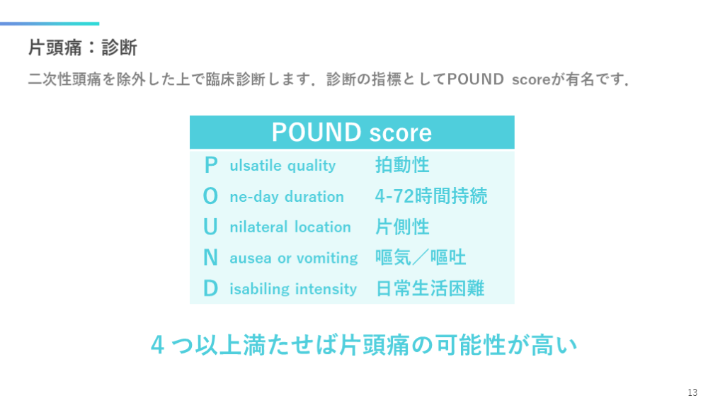 #14. 片頭痛:診断 二次性頭痛を除外した上で臨床診断します.診断の指標としてPOUND scoreが有名です. 13 4つ以上満たせば片頭痛の可能性が高い