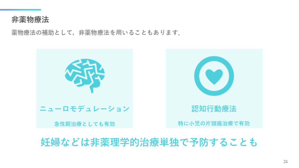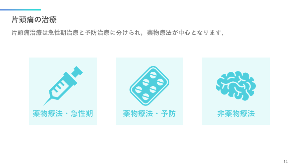 非薬物療法 片頭痛の治療 片頭痛治療は急性期治療と予防治療に分けられ,薬物療法が中心となります. 14