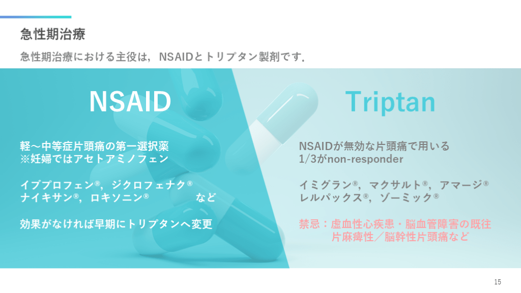 #16. 急性期治療 急性期治療における主役は,NSAIDとトリプタン製剤です. 15 軽〜中等症片頭痛の第一選択薬