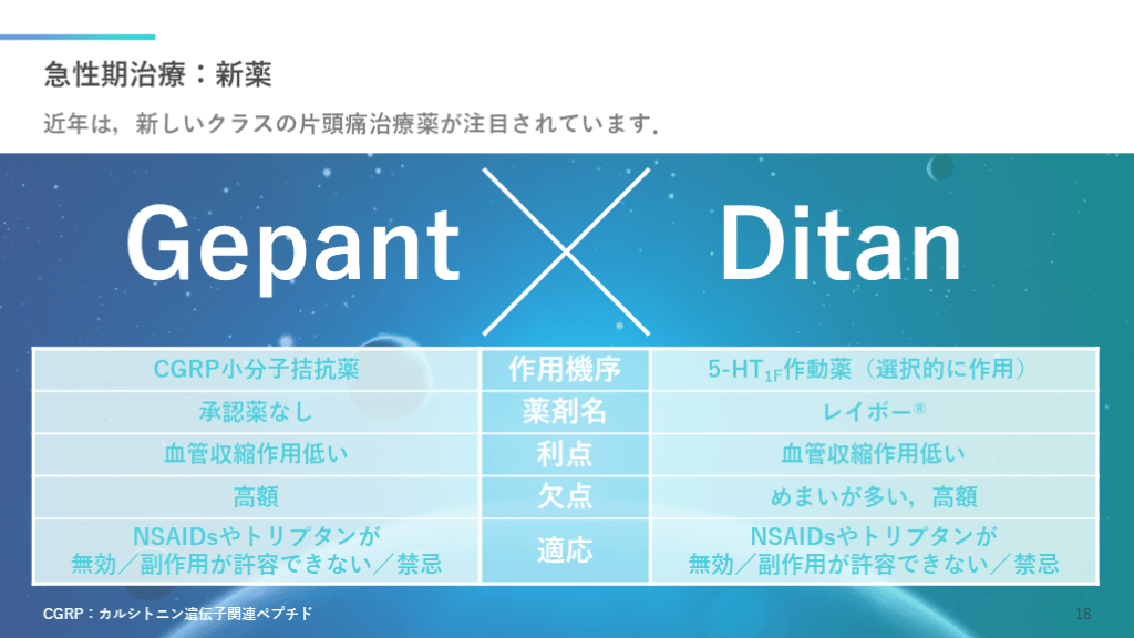 #19. 急性期治療:新薬 近年は,新しいクラスの片頭痛治療薬が注目されています. CGRP:カルシトニン遺伝子関連ペプチド 18 Gepant Ditan