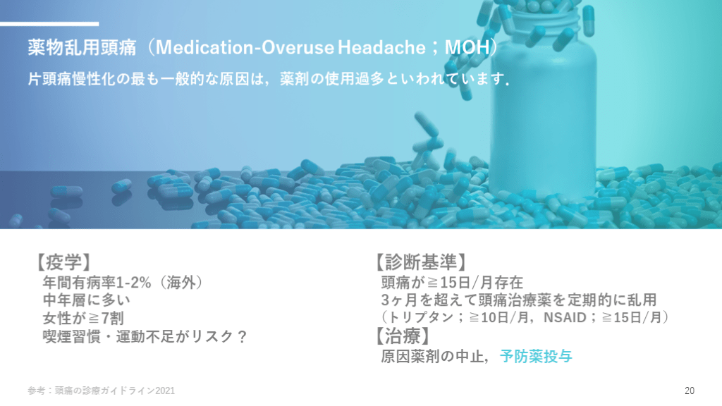 #21. 薬物乱用頭痛(Medication-Overuse Headache;MOH) 片頭痛慢性化の最も一般的な原因は,薬剤の使用過多といわれています. 参考:頭痛の診療ガイドライン2021 20 【診断基準】