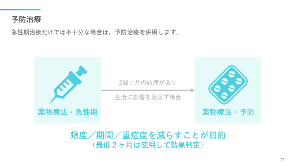#22. 予防治療 急性期治療だけでは不十分な場合は,予防治療を併用します. 21 2回≧月の頭痛があり