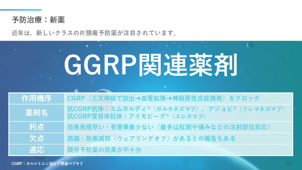 #24. 予防治療:新薬 近年は,新しいクラスの片頭痛予防薬が注目されています. CGRP:カルシトニン遺伝子関連ペプチド 23 GGRP関連薬剤