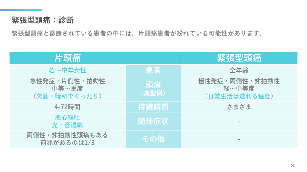 #30. 緊張型頭痛:診断 緊張型頭痛と診断されている患者の中には,片頭痛患者が紛れている可能性があります. 29