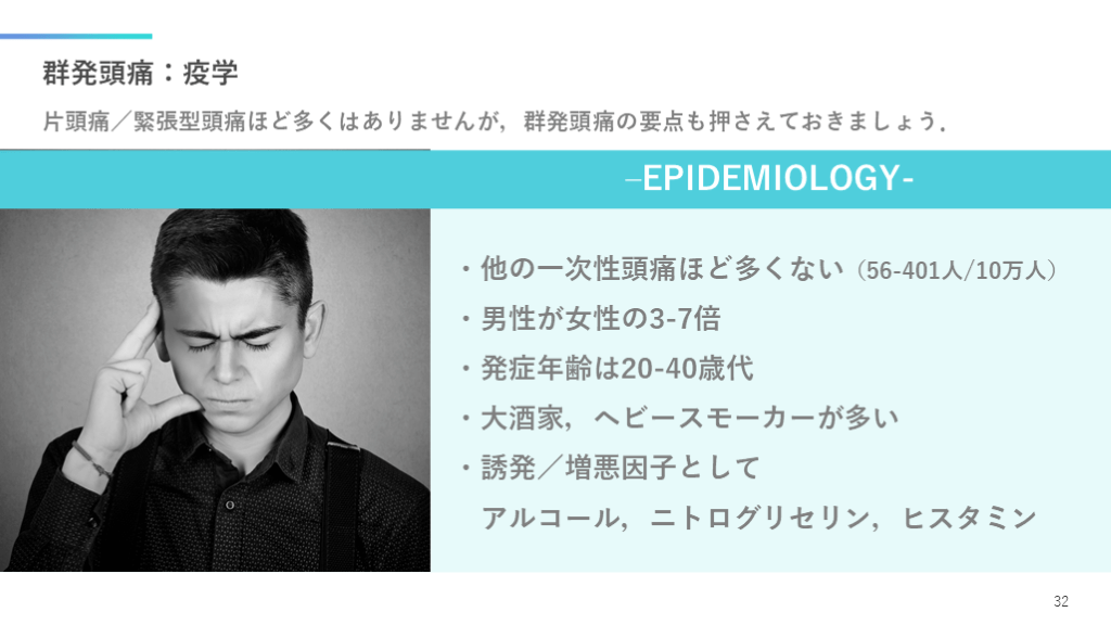 #33. 群発頭痛:疫学 片頭痛/緊張型頭痛ほど多くはありませんが,群発頭痛の要点も押さえておきましょう. 32 –EPIDEMIOLOGY- ・他の一次性頭痛ほど多くない(56-401人/10万人)