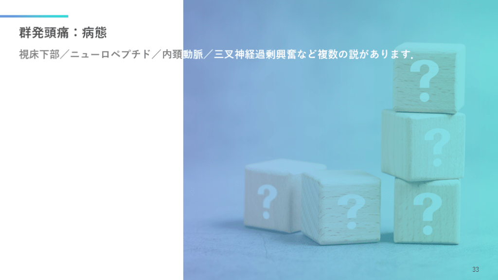 #34. 群発頭痛:病態 視床下部/ニューロペプチド/内頚動脈/三叉神経過剰興奮など複数の説があります. 33
