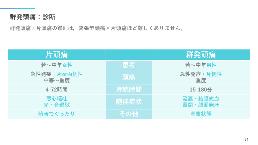 #35. 群発頭痛:診断 群発頭痛×片頭痛の鑑別は,緊張型頭痛×片頭痛ほど難しくありません. 34