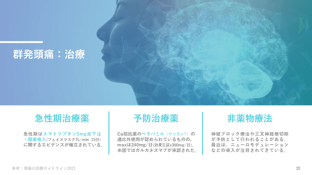 #36. 群発頭痛:治療 参考:頭痛の診療ガイドライン2021 35 急性期はスマトリプタン3mg皮下注