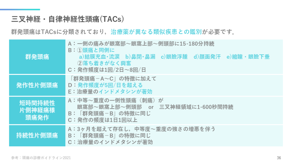 #37. 三叉神経・自律神経性頭痛(TACs) 群発頭痛はTACsに分類されており,治療薬が異なる類似疾患との鑑別が必要です. 参考:頭痛の診療ガイドライン2021 36