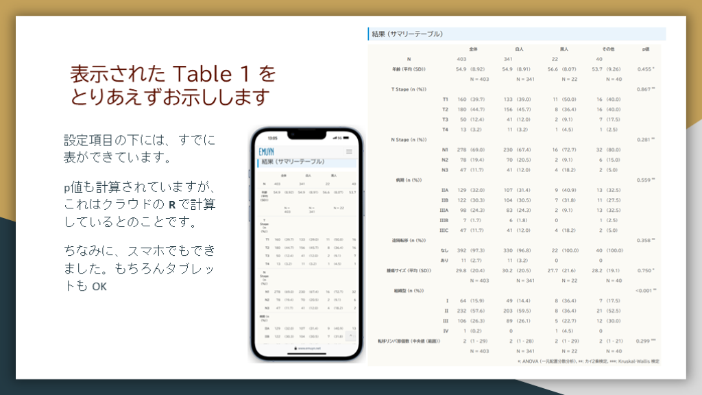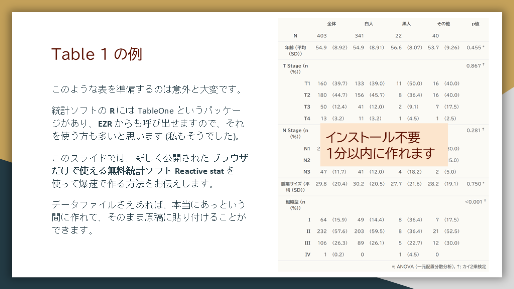 統計ソフトの R には TableOne というパッケージがあり、EZR からも呼び出せますので、それを使う方も多いと思います (私もそうでした)。
