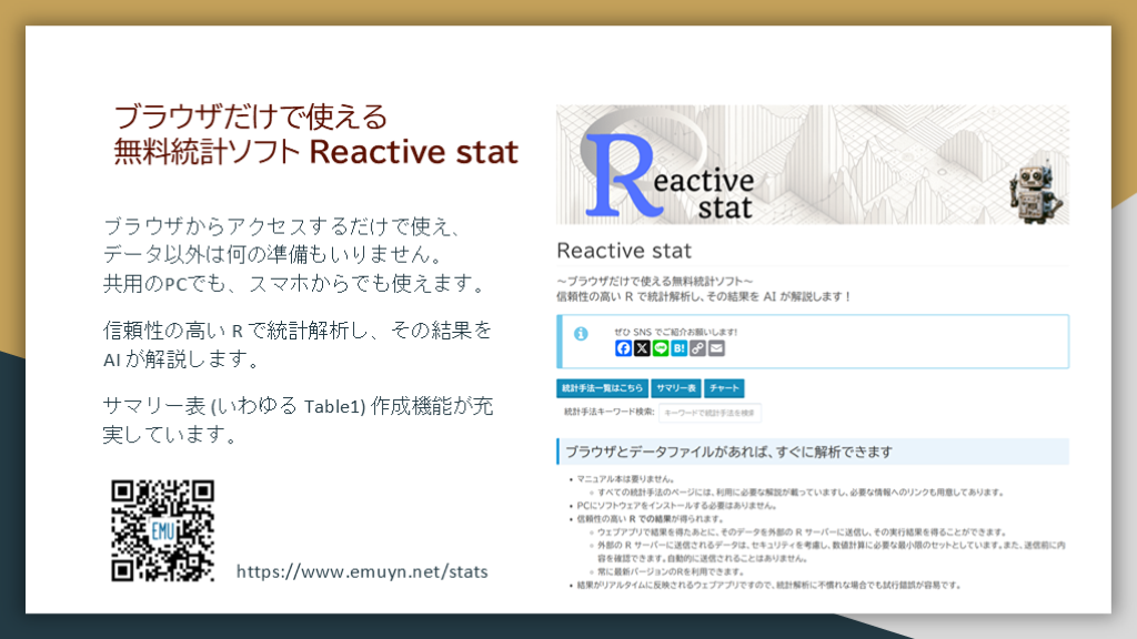 このスライドでは、新しく公開された ブラウザだけで使える無料統計ソフト Reactive stat を使って爆速で作る方法をお伝えします。