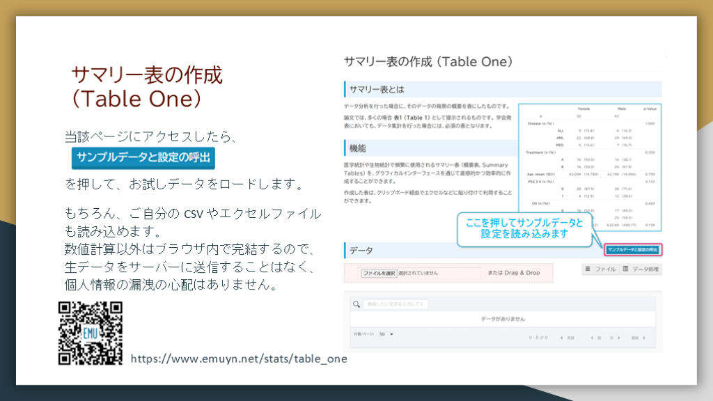 サマリー表 (いわゆる Table1) 作成機能が充実しています。 https://www.emuyn.net/stats #6.