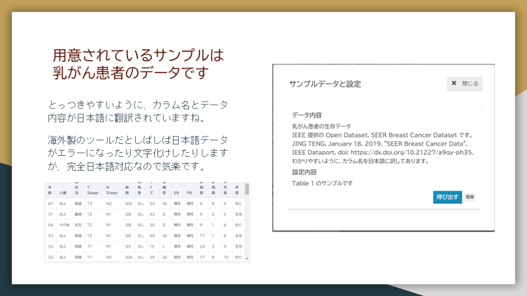 用意されているサンプルは乳がん患者のデータです とっつきやすいように、カラム名とデータ内容が日本語に翻訳されていますね。